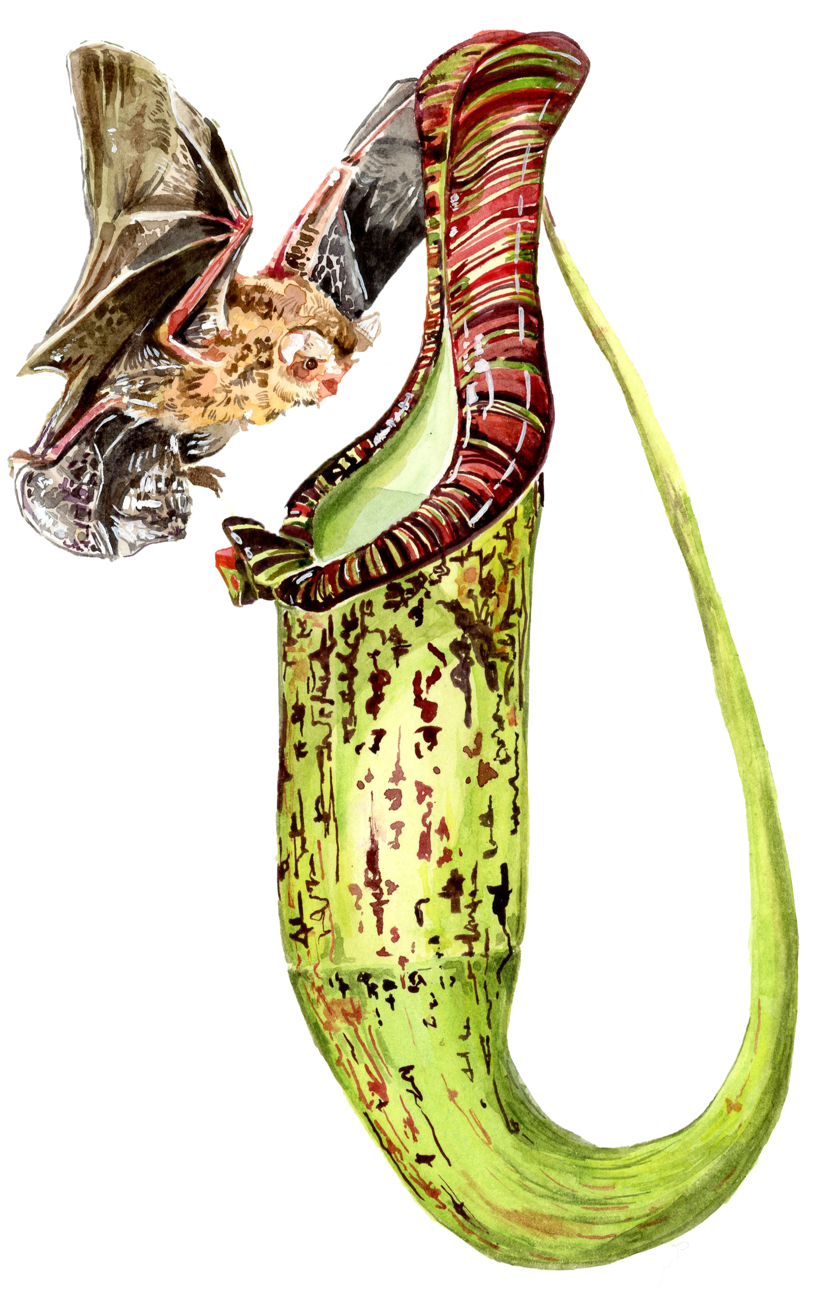 The mutualism between wooly bats and pitcher plants: bats roost inside the plant, in return they provide the plant with nutrients in the form of droppings.